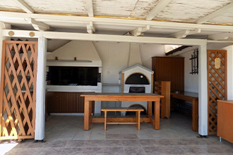 The barbeque area is spacious and it also features a pizza oven, barbeque utensils, sink and a large dining table.